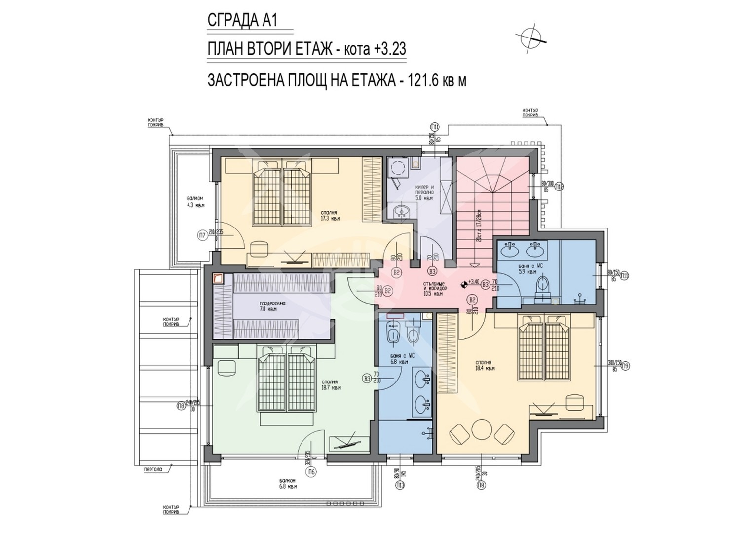 - Втори етаж - три спални, дрешмик, две бани с тоалетни и две тераси.
