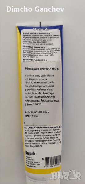 Уплътняващата паста UNIPAK е сиво, високо вискозитетно вещество, състоящо се от парафинова мастна киселина, натурални минерали, голямо количество парафинови масла и вода. Всички съставки са разрешени като добавки към храни и други подобни.ПРИЛОЖЕНИЕ: Уплътняващата паста UNIPAK се прилага заедно с санитарно-технически лен (кълчища), за запечатване на резбови съединения в тръбопроводни системи за топла и студена вода и пара под ниско налягане (max. 140 оС и 8 bar).ТЕХНИЧЕСКИ СВОЙСТВА: Уплътняващата паста UNIPAK, прилагана заедно със санитарно-технически лен (кълчища) дава 100% здравина на връзките, като предпазва резбовото съединение от корозия. След монтажът съединението има възможност да се дорегулира до 45о без загуба на херметичност. (да се върне назад, ако е пренатегнато)НАЧИН НА УПОТРЕБА: Почиства се резбата и се поставят лена (кълчищата), след което се нанася плътен слой от пастата. Сглобяването може да се извърши веднага и инсталациите да бъдат пуснати в експлоатация. Потенциалния излишък от паста лесно се отстранява с кърпа.ТЕСТОВЕ: Техническата годност на уплътняващата паста UNIPAK е била многократно подлагана на тестове от Датския Технологичен институт. Чрез този процес, се е доказало, че резбови съединения правилно запечатани с лен(калчища) и UNIPAK може да остане здраво до 140оС и 8 bar. При тестовете също така се е доказало, че пастата UNIPAK не оказва влияние върху качеството на водата в тръбопровода.това НЕ е лепило, както е обявено по някой сайтове, действа като смазка, изключително подходящо и за непрофесионалисти, разхода е малък, тази опаковка ще стигне може би за 500 връзки на половин цол.