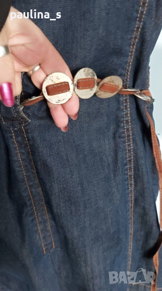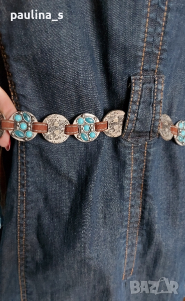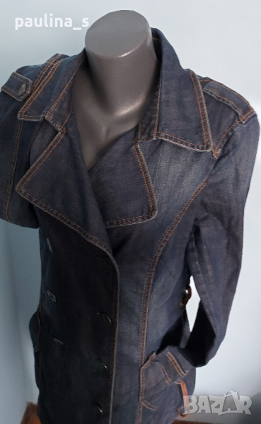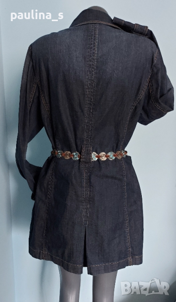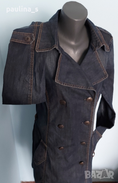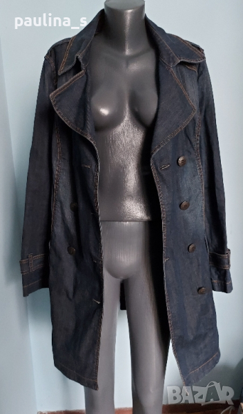 1️⃣. XL / 2XL - "Esprit". Цената е крайна 64,99лв / 30 евро. Невероятно дънково манто - модел тренчкоут от плътен и еластичен плат, с контрастни тегели, метални копчета, класически модел до 3XL. Ново е, без дефекти и етикет, има еластичност и покрива няколко размера, посочени са. Една бройка. Коланът е с посребрени елементи с тюркоази - Дължина 118см / цена 24,99лв / 12,5 евро, не се делят.