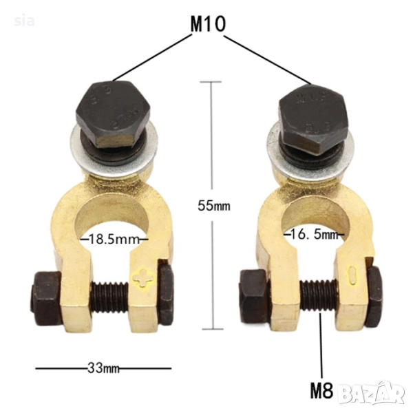 Здрави и надеждни клеми за акумулатор, предназначени за сигурно свързване на кабелите към акумулаторните изводи. Изработени от висококачествен материал с добра проводимост и устойчивост на корозия. Подходящи за автомобили, камиони и други превозни средства.