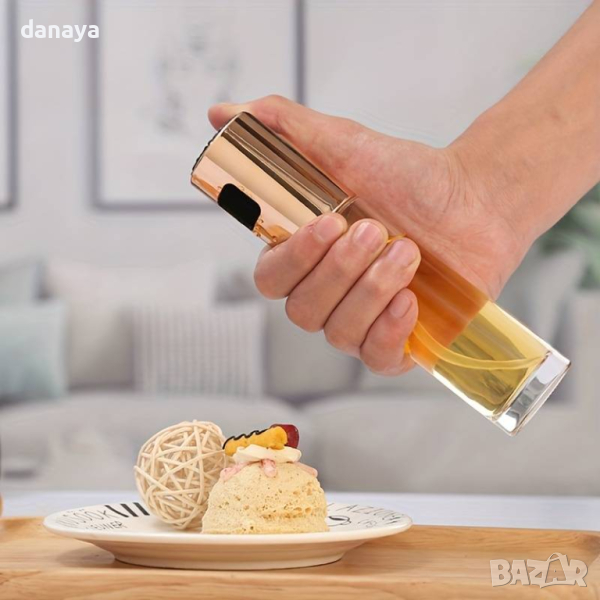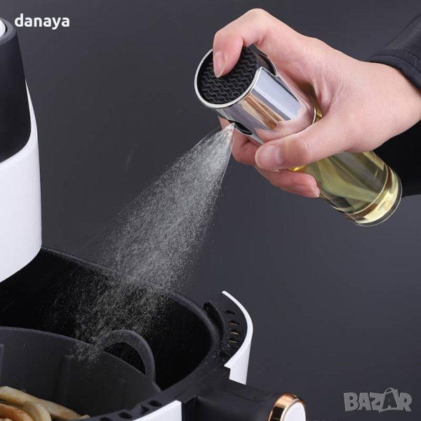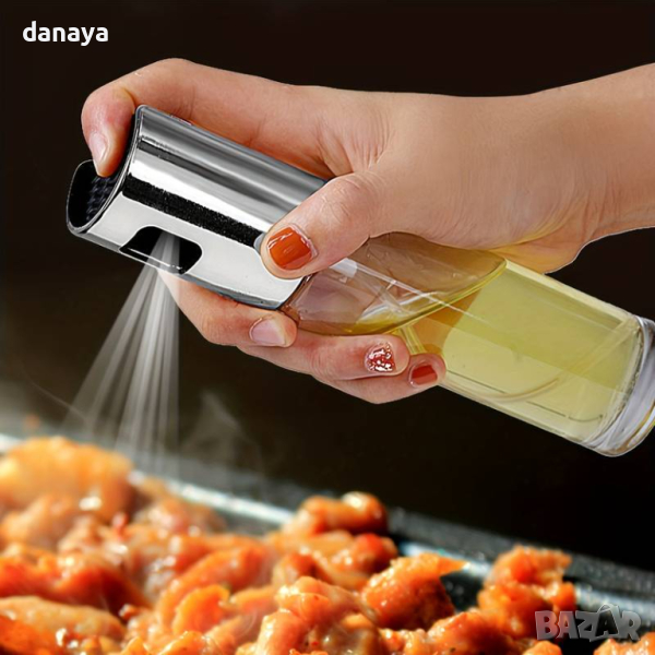 Бутилка пулверизатор за олио. Стъклена пръскачка за олио, зехтин или оцет. Спрей за олио, пръскалка. Идеална за овкусяване на салати и различни ястия, без опасност от неволно прекаляване с количеството. Често ни се налага да ползваме подобни овкусители при подправянето на салати и ястия, при пържене и задушаване, както и при приготвянето на барбекю. С помощта на кухненската спрей-бутилка ще ви бъде много по лесно. Лека и удобна бутилка от стъкло, която лесно се пълни и почиства. Диспенсър за олио в красив дизайн.
