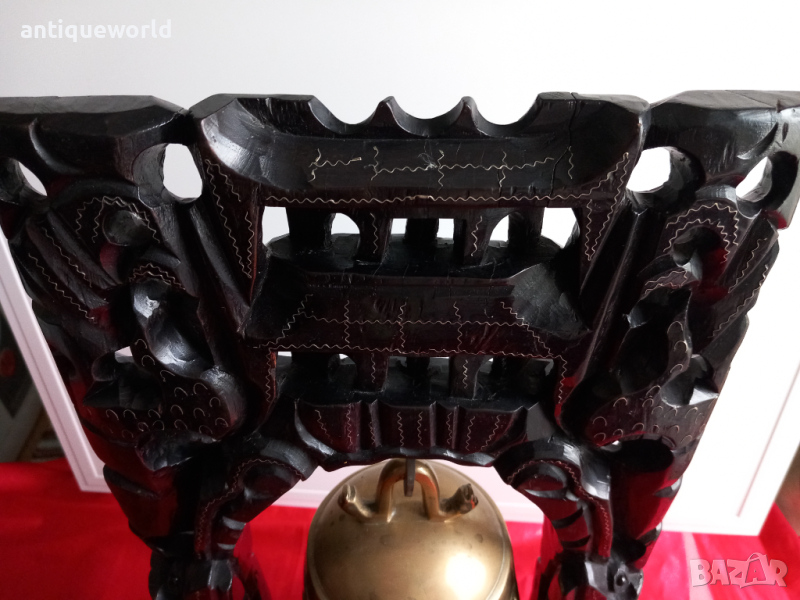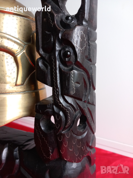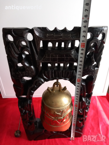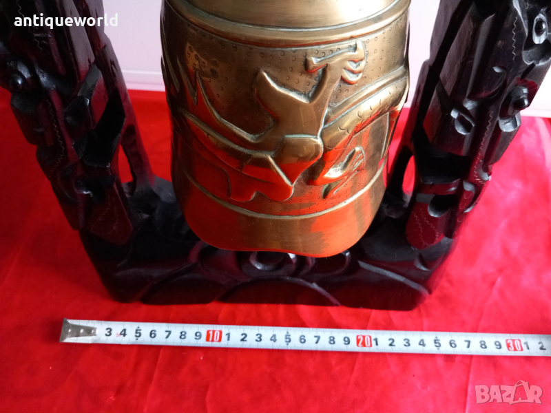 Уникален Стар Масивен БУДИСТКИ Гонг , Камбана със Стилизирани Дракони. Изработен от Ръчна Дърворезба от МАХАГОНОВО Дърво и Масивна БРОНЗОВА Камбана с Чукало.