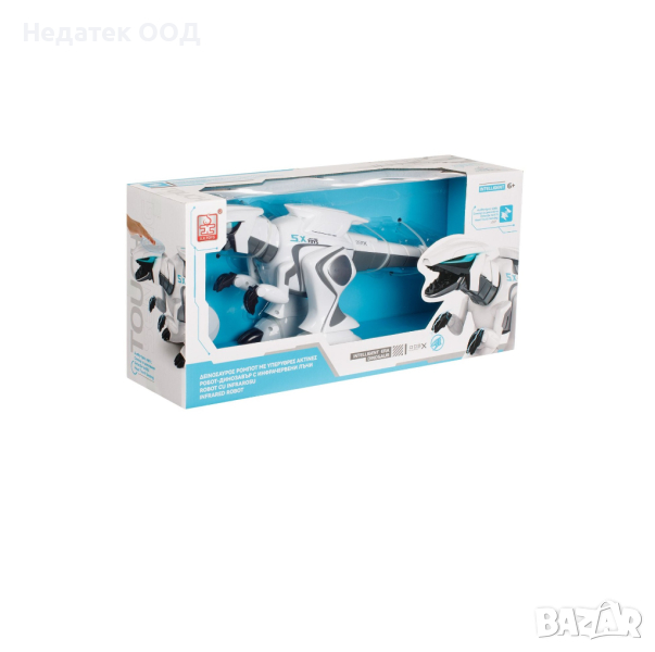 Динозавър играчка робот с инфрачервено дистанционно управление и сензор за докосване. С бионично ходене може да клати глава и опашка, има интелигентна и забавна интерактивност и аудио предварително известяване, вграден чип и система за осветление. Захранва се от 1 литиева батерия 3,7 V (и USB зарядно устройство) (включена) за робота и 2 AAA батерии (не са включени) за дистанционното управление.