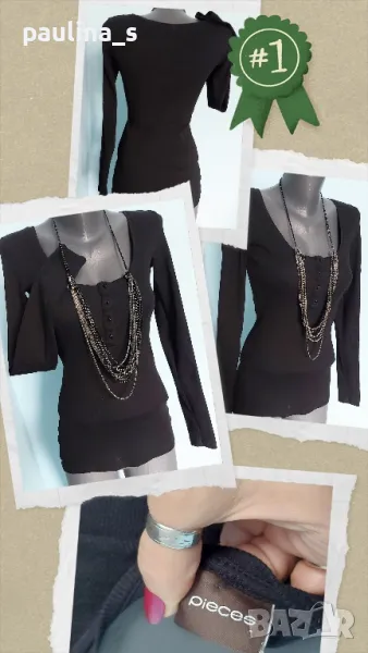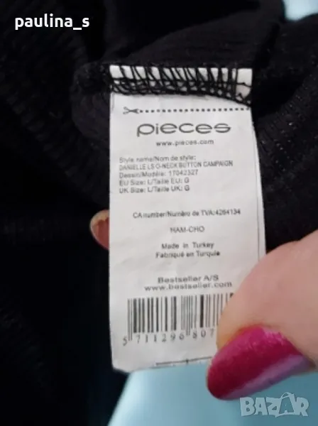 L / 3XL / "Pieces" Цената е крайна 19,99лв. Черна памучна, мноого еластична блуза с О-образно деколте с копчета, втален силует. Трикото е рипс - много плътно и еластично, покрива няколко размера, посочени са. Една бройка е, без дефекти и етикет. Материята е памук и ликра, хипоалергична и приятна за носене и допир до кожата.