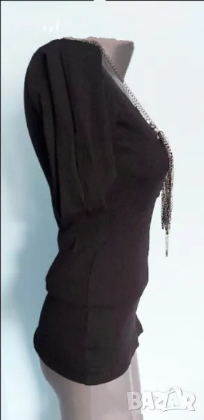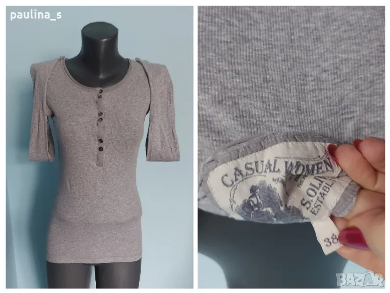 1. Колаж / M / 2XL "S'Oliver". Цената е крайна 22,99лв. Маркова еластична блуза с дълъг и декорации в детайли. Има О-образно високо деколте, завършено с трико без поръбване, около копчетата платът е текстил, копчетата са малки бижута, леко втален силует. Материята е памук и ликра, мноого фина и мноого еластична, покрива няколко размера, посочени са. Без дефекти е, една бройка. Перфектна изработка, гарантирано от бранда.