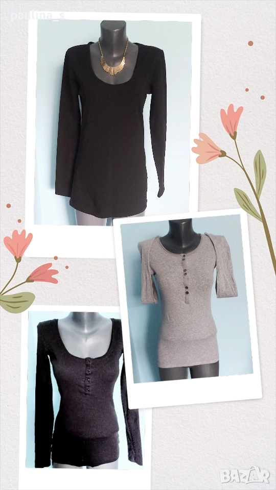 1️⃣. Колаж / M / 2XL "S'Oliver". Цената е крайна, без пазарлъци 12,5 евра. Маркова еластична блуза с дълъг и декорации в детайли. Има О-образно високо деколте, завършено с трико без поръбване, около копчетата платът е текстил, копчетата са малки бижута, леко втален силует. Материята е памук и ликра, мноого фина и мноого еластична, покрива няколко размера, посочени са. Без дефекти е, една бройка. Перфектна изработка, гарантирано от бранда.