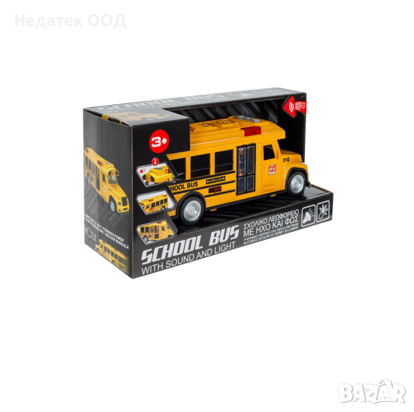 Жълт училищен автобус със светлини, работещи звуци, отваряща се и затваряща се врата и знак СТОП за предупреждение на другите шофьори.Издърпайте го назад и го оставете да се движи бързо напред.Работи с 2 батерии AAA (включени).