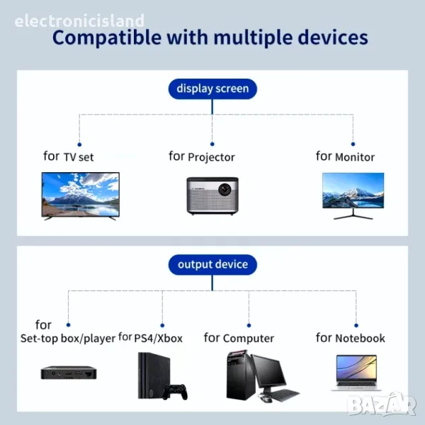 Tv box, Upconvertor, DVD плейър, PS, LCD монитор и проектори.