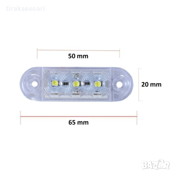 12V-24V - 3 LED преден маркер токос габарит - за бус платформа камион ремарке автобус - 65 мм х 10 мм - бял
