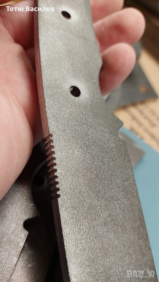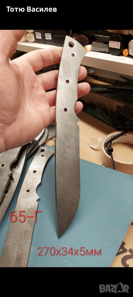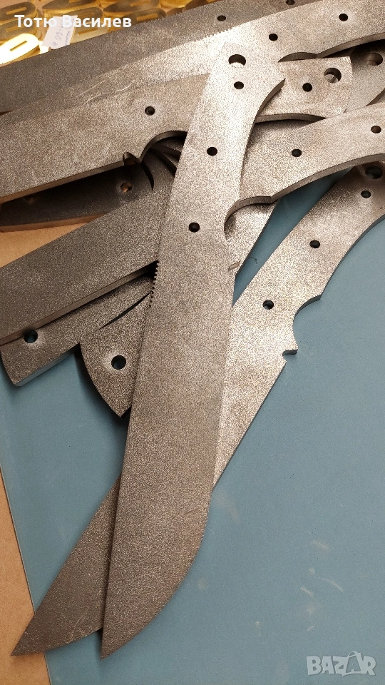 Заготовките са лазерно изрязани с отвори за нитове. Не са закалени!Не са скосени и заточени.Предлагам и материали за ръкохватка(дръжка)G10,микарта,рог,кост,стабилизирана дървесина и др.Нитове:Инокс,месинг,карбон и мозаечни пинове ,корби нитове 6мм и 8мм -1€