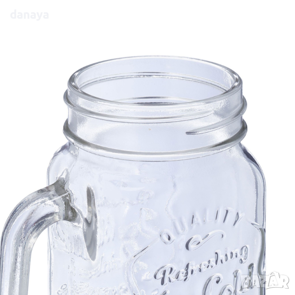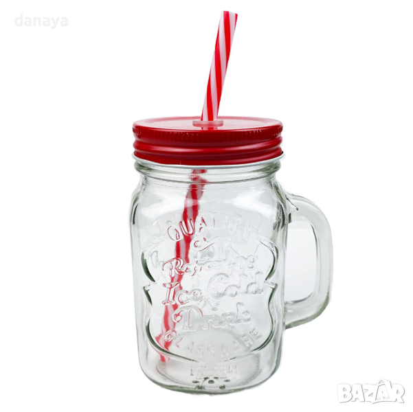 Стъклен буркан с дръжка и цветно капаче с дупка за цветна сламка. Буркан тип чаша идеален за коктейли, плодова вода, лимонада, топли и студени напитки. Можете да го използвате за сервиране на кафе, млечни шейкове и пресни сокове по време на непринудени вечери или за детски партита.