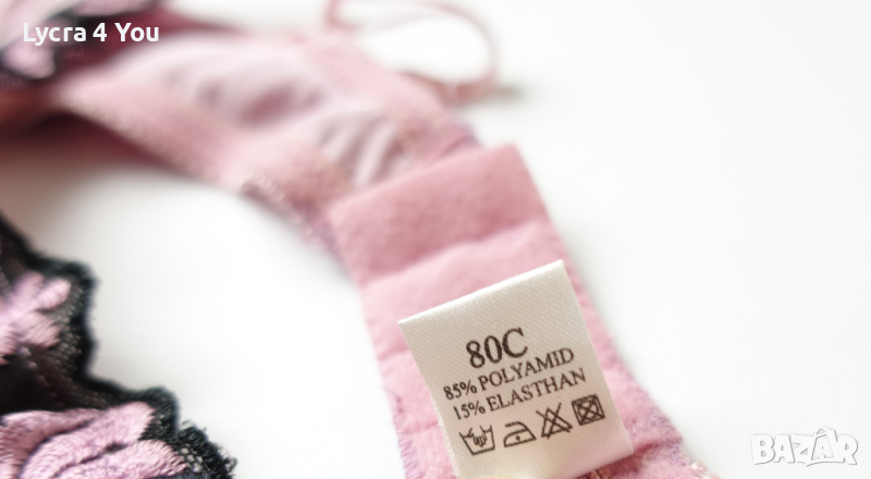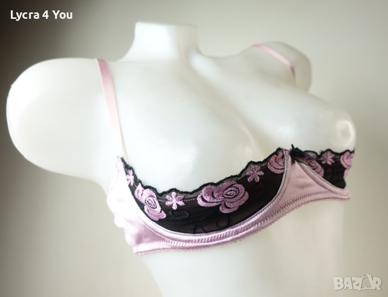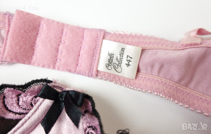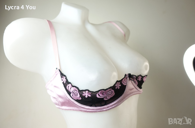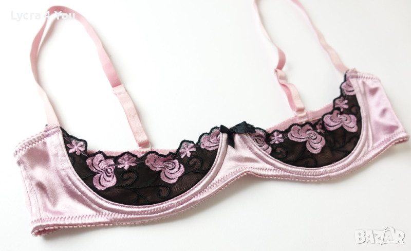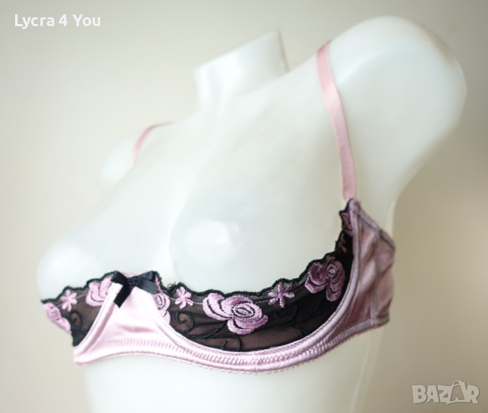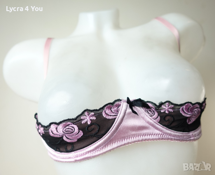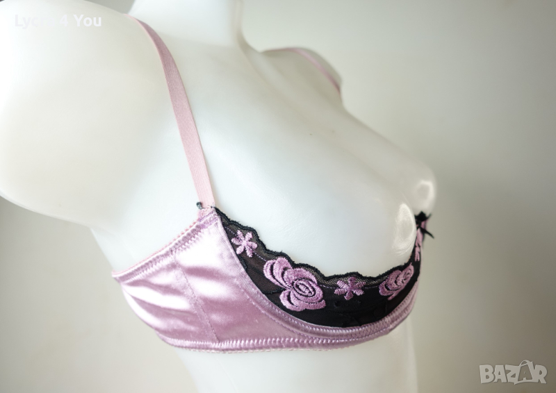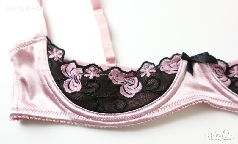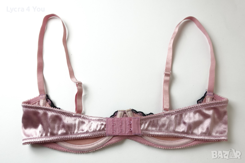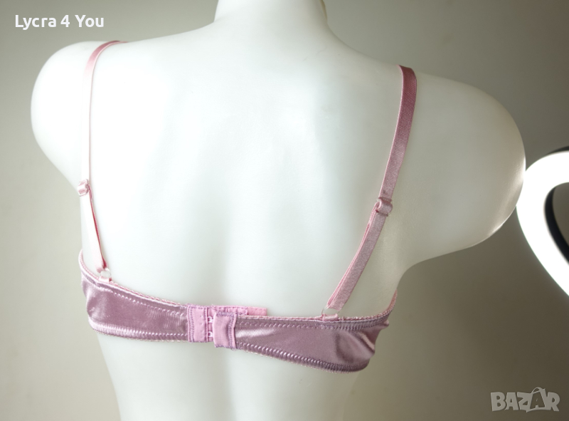Розова сатенена лъскава материя с бродерия на получашките, които са с банели. С регулация на презрамките и гърба, който е с двойно триредово закопчаване.