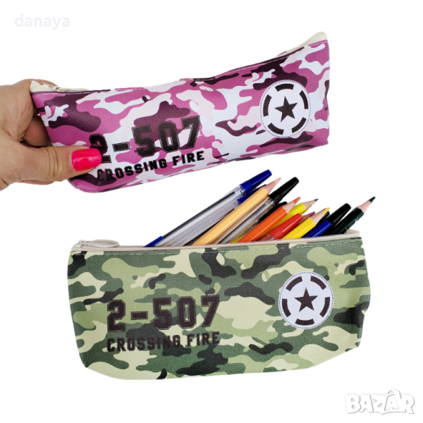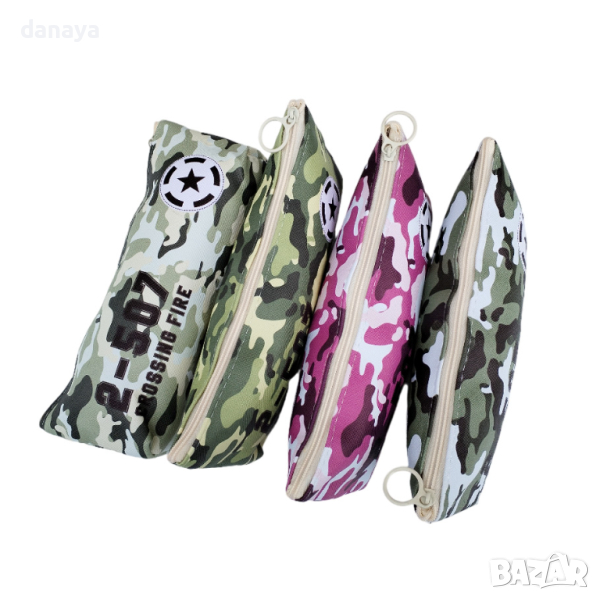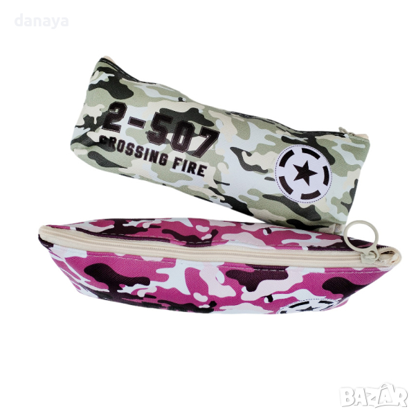 Ученически несесер за съхранение на химикали, моливи, ножичка за рязане, гумичка и още много ученически консумативи. С камуфлажен принт в три нюанса на зеленото и розов цвят. Компактен размер, побира се във всяка раница. Несесерът се затваря с цип. Външната част е изработена от изкуствена кожа. Лесен за поддръжка.