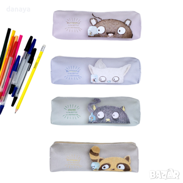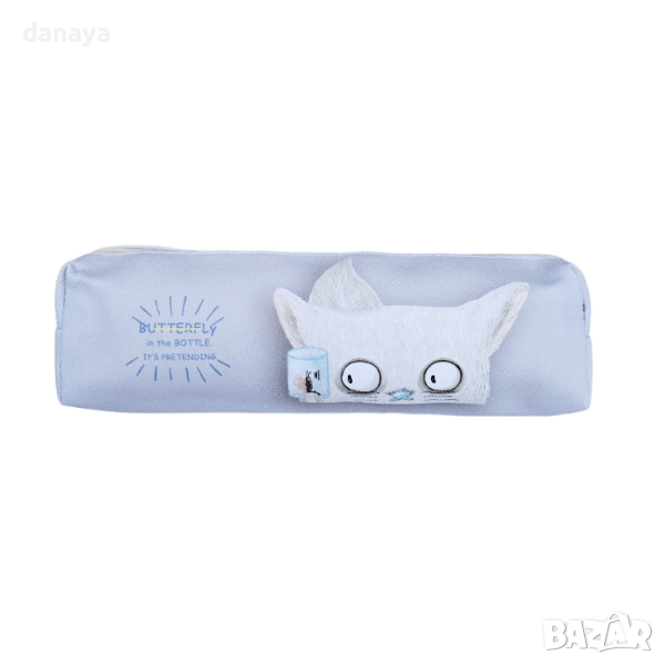 Ученически несесер за съхранение на химикали, моливи, ножичка за рязане, гумичка и още много ученически консумативи. Дизайн, съчетан в нежни пастелни цветове и закачлив принт на палаво коте, наблюдаващо пеперудка в бурканче. Компактен размер, побира се във всяка раница. Несесерът се затваря с цип. Външната част е изработена от изкуствена кожа. Лесен за поддръжка.