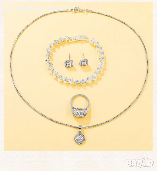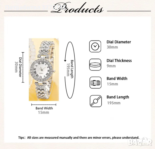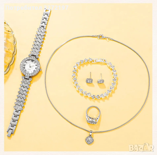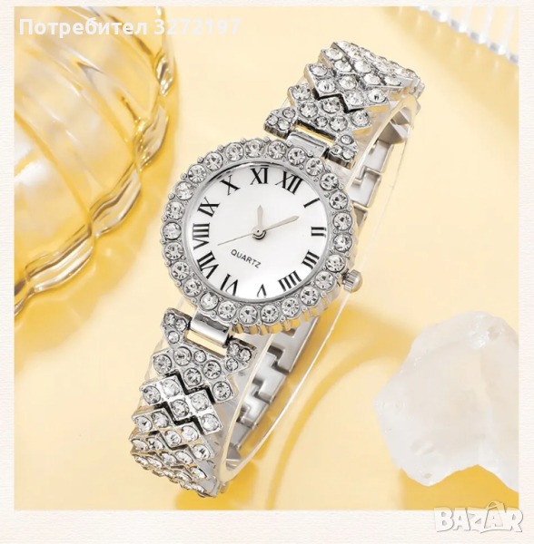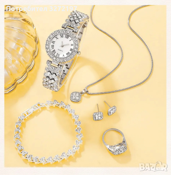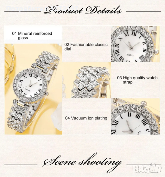 • Дизайн, инкрустиран с кристали: Часовникът, пръстенът, колието и обеците са украсени с искрящи кристали, добавяйки нотка блясък към всяко облекло.
