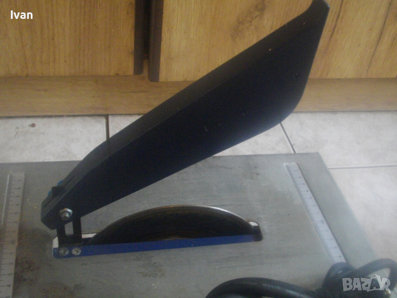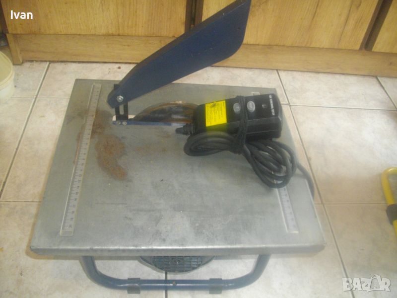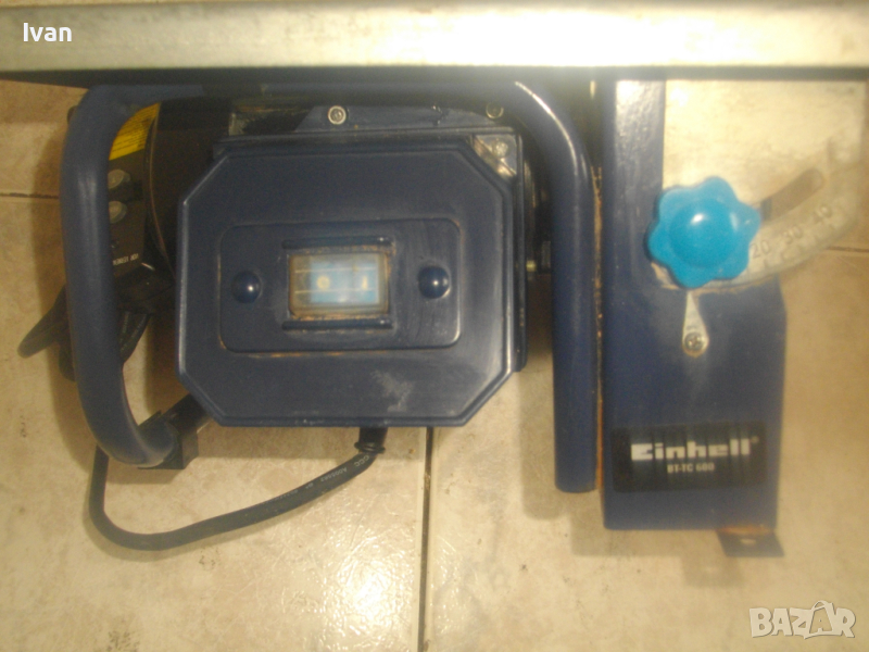 ОПИСАНИЕ на синя 600 вата ел. машина за рязане на плочки/плочи - фаянс, теракот, керамика, декорации, керемиди, тухли, тротоярни бетонови плочи, камъни и др. неметални повърхности с дебелина до 35 мм. Цена на машината - 209 лв. Марка и модел - Einhell TC 600. Производство Made in China /01/- регион 1 - за Западна Европа - 2010 г. Упоменато време на работа с 1 пуск - S2 - 10 min. Мощност на мотора - 600 вата, скорост - 2950 об/мин. Наклон плот - 0-45 градуса. Рязане дълбочина при 90 градуса - 35 мм плоча. Машината е почти нова в отлично техническо/работно състояние. За сухо и мокро рязане. Липсва вана под диск при мокро рязане, но може да се постави всякакъв друг съд под форма на тавичка, с подходящи размери. Метален голям плот с размери 360 х 330 мм, разграфен от двете страни 0-20 см. Капак над диск предпазителен. Поставен оригиален почти нов режещ диск диамантен диамантина размер ф 180 мм, в отлично състояние. Бронзов, немски, с немски надписи по него. Височина на машината от земята - 250 мм. Кабел оригинален с тест щепсел защита 16 ампера - 16A/30 mA/30 mS - Щепсела се води щепсел с дефектнотокова защита и при претоварване на машината щепсела изключва захранването.Щепсела защита е оригинален немски висок клас на Интертек - Sanyi Electric Typ RCD-SA Intertek 230 V - 50 Hz. 2 бутона на него Reset при изключване и пусков. Тегло на машината - 8,1 кг. Цена - 229 лв. Твърда цена/без коментар.