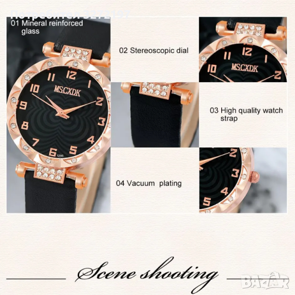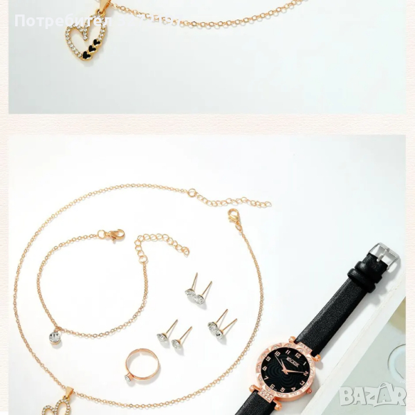 Моден комплект аксесоари: Този комплект включва кварцов ръчен часовник и бижута като колие, гривна, обеци и пръстен, осигурявайки пълен и шикозен комплект аксесоари за всяко облекло.