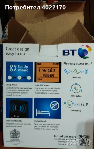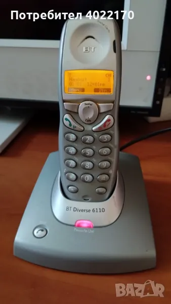 4. BT (British Telecom) DIVERSE 6110 - Ползван до преди време в Англия, включен в ел. мрежата светва, работи с 2 бр. зареждащи се батерии ААА (не са включени такива в цената). Комплект с адаптер за ток с английски щепсел и телефонен кабел . Цена 8 евро.