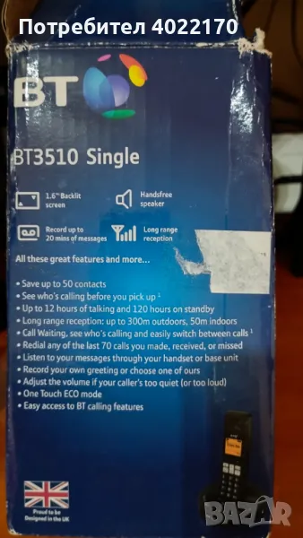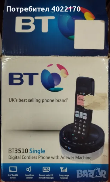 3. BT (British Telecom) 3510 - Безжичен телефон със секретар, ползван съвсем малко, има-няма 1-2 месеца до преди 2 години. Купуван е чисто нов от Англия. Няма следи от употреба. Комплект с кутия, книжка, адаптер с английски щепсел, телефонен кабел. Работи с 2 бр. зареждащи се батерии ААА, които не се дават с комплекта. Цена 31 евро.