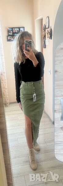 Полата е нова, с етикет. Онлайн покупка ми е, уж размер S, но си е М и ми е голяма. Много интересен модел, във войнишко зелен цвят.