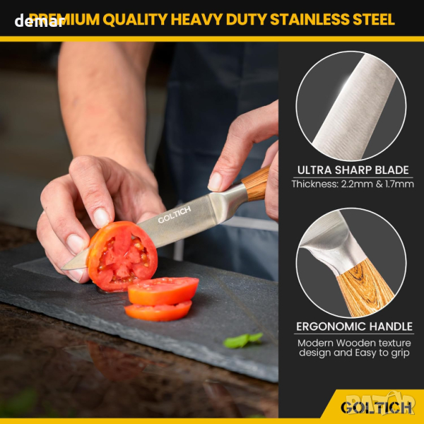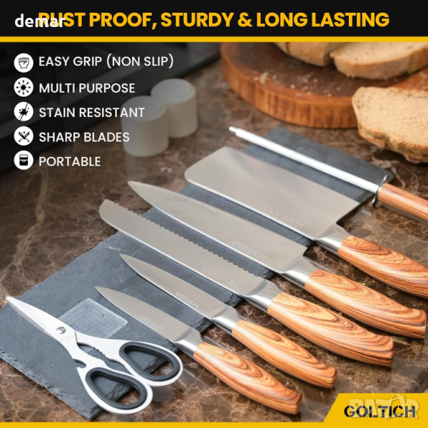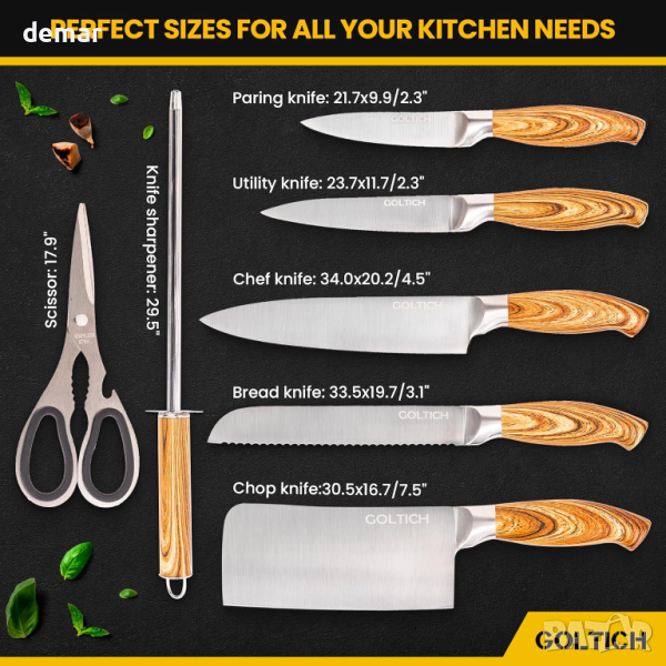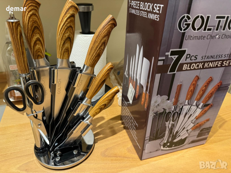 GOLTICH Комплект кухненски ножове от неръждаема стомана 7 части с акрилна въртяща се стойка и точило