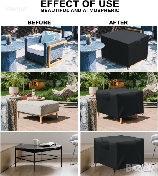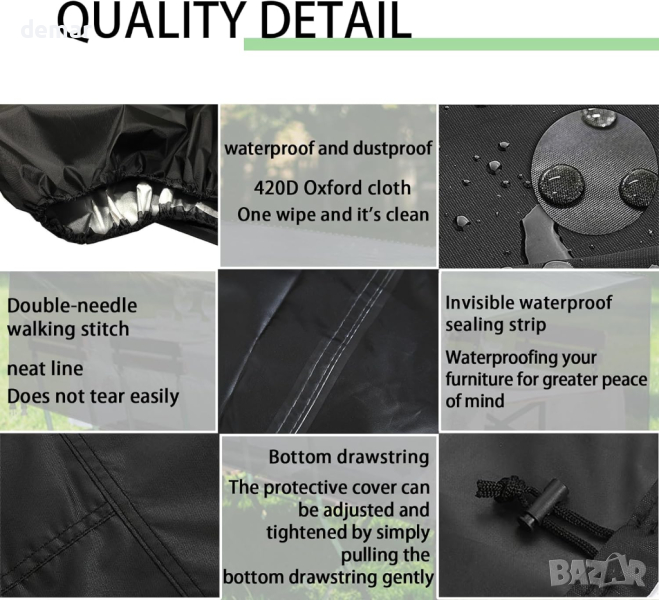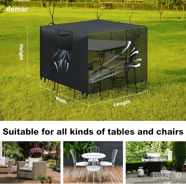 градински мебели са изработени от превъзходен водоустойчив материал, предлагащ отлична защита срещу вода и вятър. Проектирани с мисъл за дишането, те гарантират, че вашите външни мебели остават в безупречно състояние, без влага, мръсотия и ръжда, дори при бурни условия. С двойно подсилен ветроустойчив дизайн с ъглови щипки и регулируем еластичен шнур, нашите калъфи предлагат несравнима сигурност и плътно прилепване към вашите мебели. Универсални в употреба, те са идеални за покриване на градински кутии за съхранение, барбекюта, столове за яйца, дивани, външни маси и други, като предпазват вашите предмети от атмосферните влияния. Леки и лесни за работа, тези калъфи могат да се почистват без усилие с просто изплакване и изсушаване на слънце.