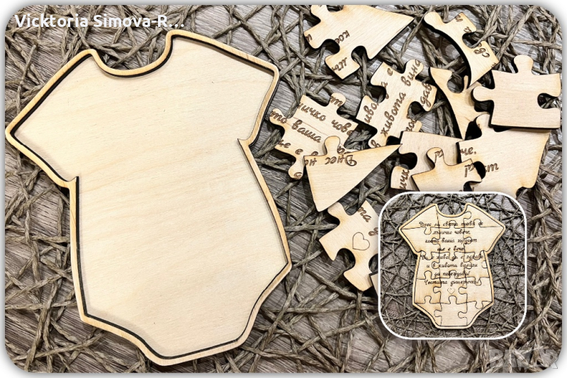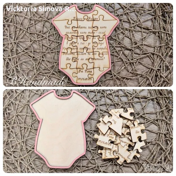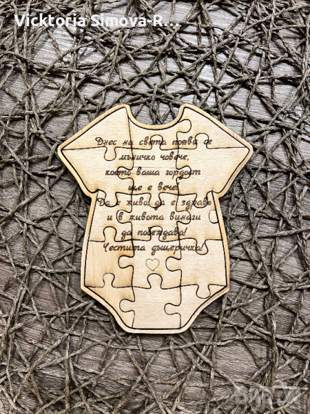 Персонализирана картичка с послание по Ваше желание, от дървен материал, под формата на пъзел за редене, на която може да има текст по ваш избор: визитката на новородено бебе, покана за кръстници на бебе, честитка за новородено бебе, честитка за рожден ден на бебе и тн.