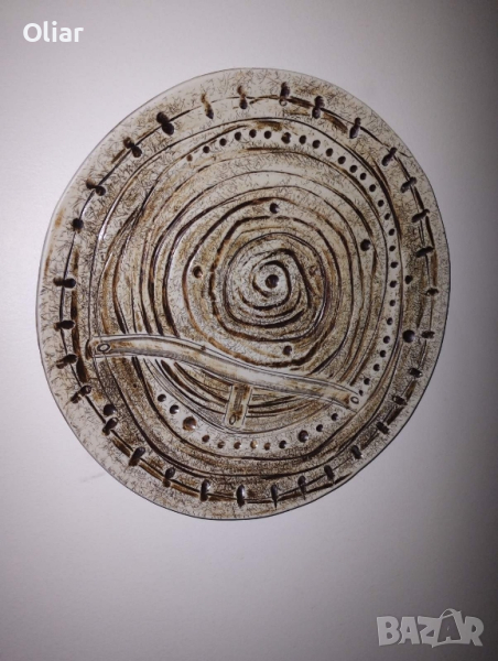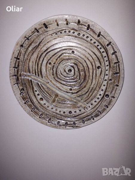 Прекрасна чиния, художествена керамика. Автор Светозар Петков. Много красива, ръчна изработка. Има интересно, мистично излъчване. Диаметър 32 см. Подписана. Моля погледнете и останалите ни обяви!