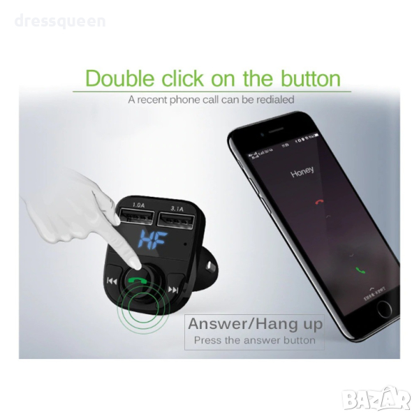 При позвъняване на телефона, автоматино спира музиката и може да приемете обаждането и да разговаряте с помощта на аудио системата на автомобила, като микрофона е вграден в FM трансмитера. След приключване на разговора, музиката продължава автоматично.