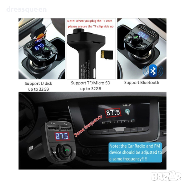 HY-82 FM Трансмитер Bluetooth, USB, FM аудио предавател, MP3 плейър, Handsfree