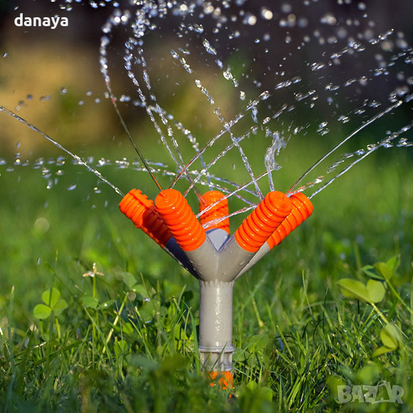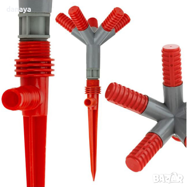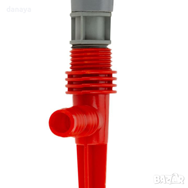 Практична градинска пръскачка с въртяща се функция и удобно шило за закрепяне в земята.
