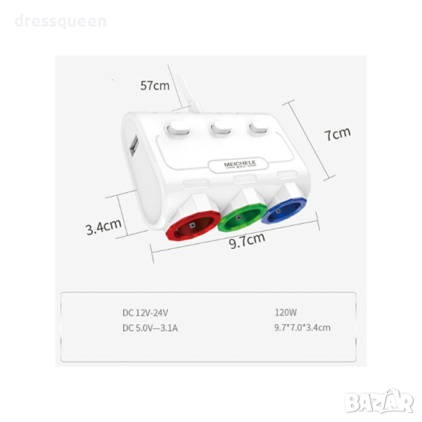 Опростен и компактен дизайн, лесен за инсталиране и използване. Изработен от пластмаса, гумиран ABS материал, здрав и издръжлив във времето. Предлага три гнезда за запалка двете се използват само като разклонители, а едното гнездо може да се използва със самата запалка на автомобила. В двата края на този разклонител се намират два USB порта за зареждане на таблети, смартфони, MP3, MP4, GPS и т.н.