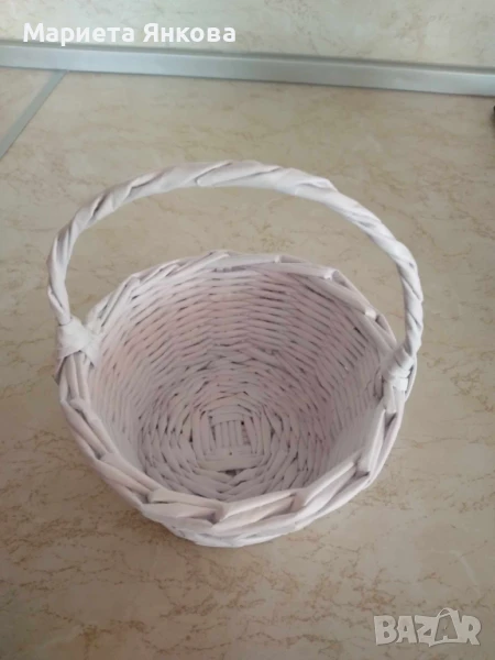 Кошничките са изплетени от рециклирана хартия. Обработени са с лепило и лак на водна основа за издържливост. Диаметър 13 см и височина 7см.. Цената е за един брой.