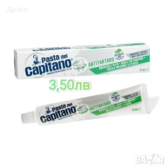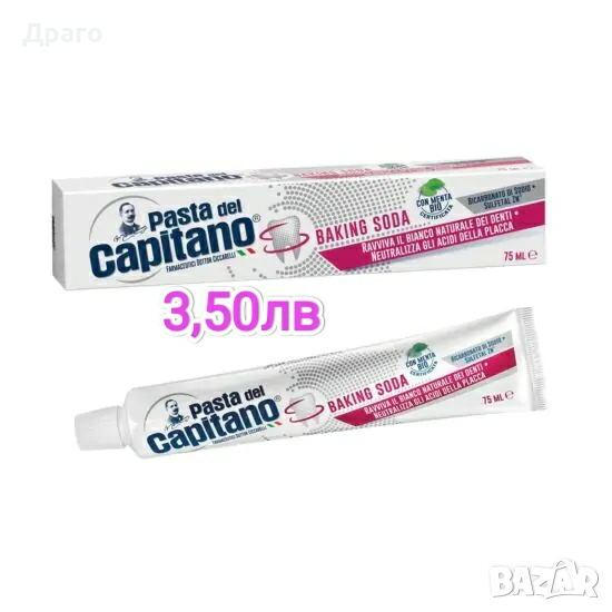 Пастите за зъби Pasta del Capitano имат нова туба: тя е от PBL, изработена от пластмаса без алуминий, следователно напълно Рециклируема! всяка опаковка съдържа 100мл паста4 модела: •••CARBONE -Натурална избелваща паста за зъби с активен растителен въглен. Естествено избелващо средство за зъби в ЧЕРНА ПАСТАПомага за възстановяване на естествената белота на зъбите, осигурявайки свеж дъх, без да уврежда емайла, благодарение на: Sulfetal Zn®, оригинална молекула с цинк, която има почистващи и антибактериални свойства; Активен растителен въглен с абсорбиращи свойства, които позволяват ефективно избелващо действие. Пастата за зъби с активен зеленчуков въглен Pasta del Capitano има избелващо действие върху зъбите, без да уврежда емайла, и помага в борбата с причините за лошия дъх. Използвана всеки ден, пастата за зъби с активен растителен въглен Pasta del Capitano действа деликатно, но ефективно върху веществата, които могат да оцветят емайла, като допринася за постепенното възстановяване на естествената белота на зъбите. Активният растителен въглен упражнява естествено избелващо действие върху зъбите. Редовната употреба помага да се противодейства на образуването на петна по зъбите и лошия дъх, причинени от кафе, цигарен дим и храна, без да уврежда емайла. •••Antitartaro -Против плака • Против зъбен камък • Органична ментаПаста за зъби Pasta del Capitano Antitartaro, благодарение на екстракти от градински чай и мащерка и пир фосфати, помага за предотвратяване образуването на бактериална плака, която причинява зъбен камък, като същевременно освежава дъха. Идеален и за пушачи. •••Baking Soda -Бикарбонат • Органична мента • ИзбелванеПаста за зъби със сода за хляб Pasta del Capitano, с натриев бикарбонат, която избелва зъбите, без да уврежда емайла. Формулата му спомага за неутрализиране на киселините от бактериалната плака, гарантирайки ефективна защита на устната кухина. •••Placca e Carie - Плака и кариесАнтикариес • Аантиплака • БИО ментаЕфективното решение за борба с плака и кариес, за ежедневна и безопасна орална хигиена, без парабени, триклозан. Pasta del Capitano plaque and caries е пастата за зъби, която помага за дълбоко почистване на устната кухина и ефективна защита срещу образуването на плака и кариес. Двете флуорни соли, присъстващи във формулата, благодарение на способността си да прилепват към емайла, допринасят за ре минерализацията на зъбите, оставяйки дъха свеж и ароматен. Plaque and Caries е идеалната паста за правилна ежедневна орална хигиена за цялото семейство: предпазва зъбите и венците, без да атакува емайла. Пастите за зъби Pasta del Capitano имат нова туба: тя е в PBL, изработена от пластмаса без алуминий, следователно напълно рециклируема!Само в нашият магазин в Благоевград ж.к Еленово булевард Пейо Яворов 88 В. Табак Vicio