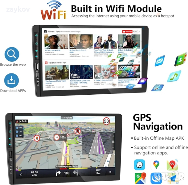 GPS навигация и WiFi: Вграден WiFi, поддържа връзка с WiFi/WiFi гореща точка, можете да изтеглите допълнителни приложения към радиото на колата. Вграден GPS приемник, можете да изтеглите безплатни карти от приложението за навигация „Here We Go“ в менюто „Изтегляне на карта“ и да се насладите на офлайн навигация по-късно. Или можете да използвате други приложения за онлайн карти.
