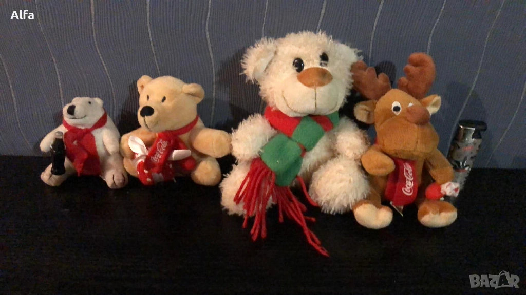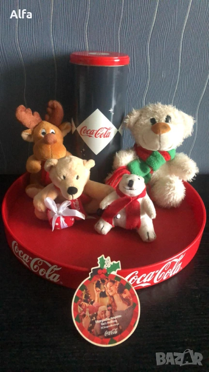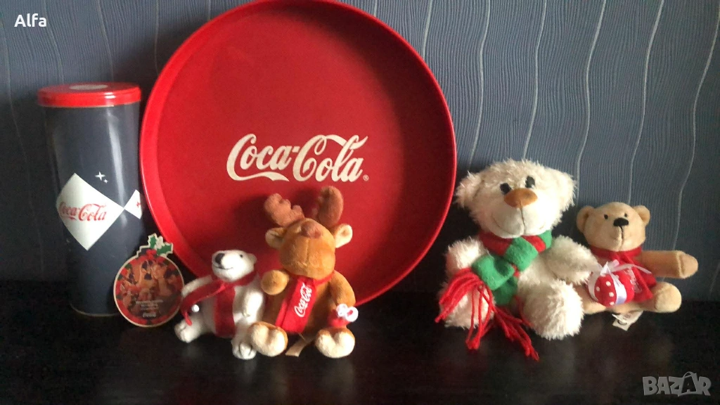 Лот Кока кола аксесоари - поднос, кутия, магнитче, плюшени играчки от награди. Обща цена 25€.