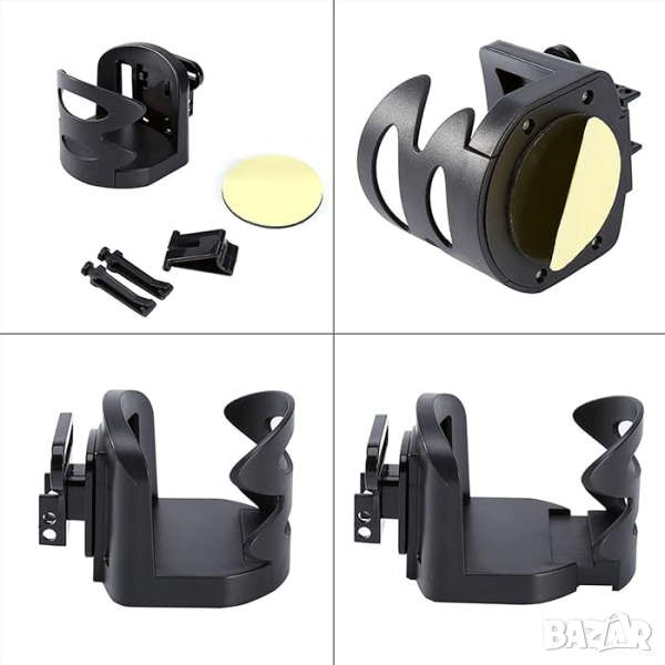 Универсална стойка за чаша, кенче или бутилкa. Закрепва се със скоби към въздуховодите (парното) на автомобила.