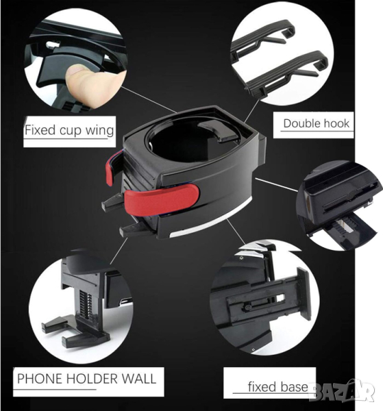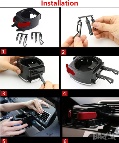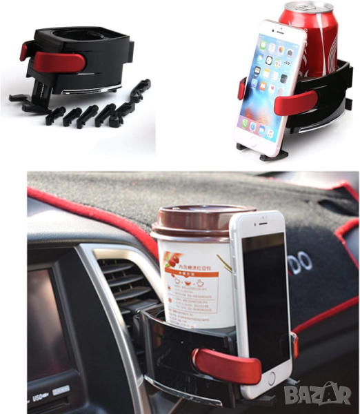 Универсална поставка за чашa с закрепващи скоби към въздуховодите (парното) на автомобила.