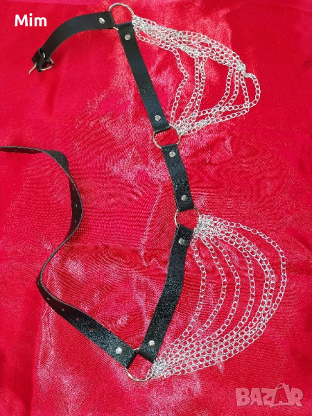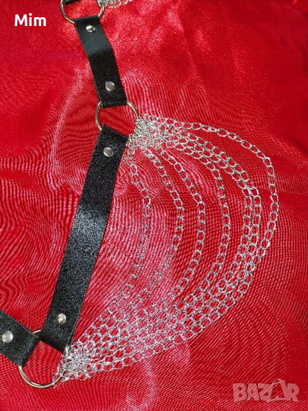 Черна кожа съединени с метални халки,закопчаването е отзад с катарама, странично от двете страни с 7 реда сребрист синджир. дължина 100 см. Нов в опаковка