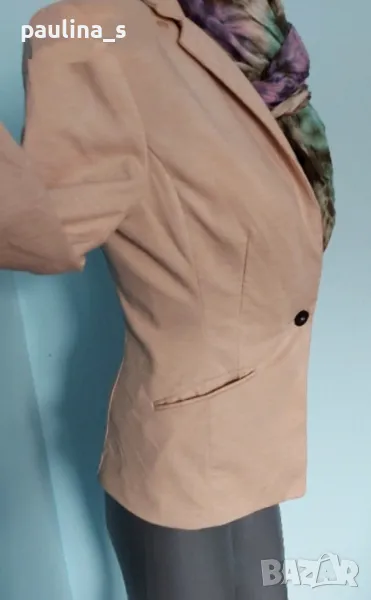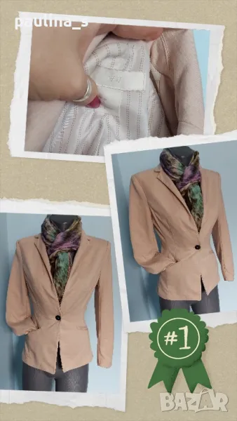 2️⃣. Колаж / XS / S / M - "H&M" Вталено марково сако, цвят Нюд. Цената е крайна 19,99лв / 10 евро. Стилно марково сако с втален силует, интересни ревери и кройка. Платът е трико и има еластичност. Ново е, без дефекти и етикет, една бройка е, има еластичност и покрива няколко размера, посочени са.
