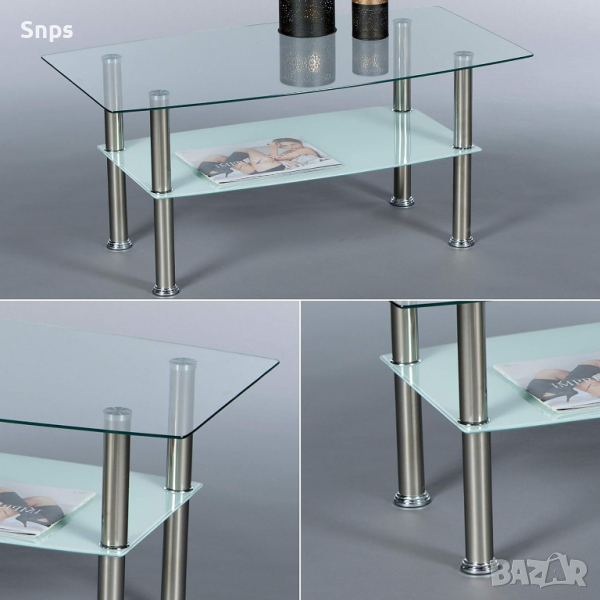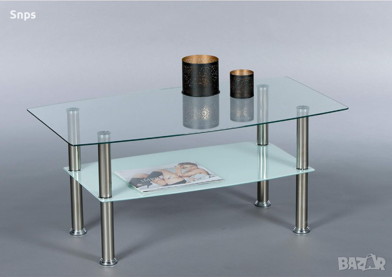 Вечен дизайн – холната маса се състои от прозрачен стъклен плот, метална рамка и рафт от матирано стъкло. Масата е модерна, практична и чудесно допълнение към вашия хол.