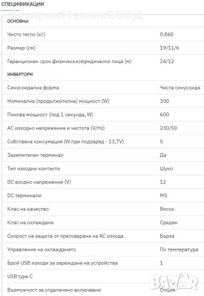 *Пикова мощност: 600W - налична е за част от секундата! Тя е необходима за стартиране ня някои консуматори при които необходимата мощност за „развъртане“ на електромотора е в пъти по-голяма от нужната след това. За пример хладилник за домашна употреба в повечето случаи изисква стартова (пикова) мощност от около 900 вата а секунда след това продължава да консумира едва 50-90 вата. Такива електроуреди са компресорните хладилници, класическите фризери и климатици които нямат плавен старт, винтовите подемни крикове и т.н.