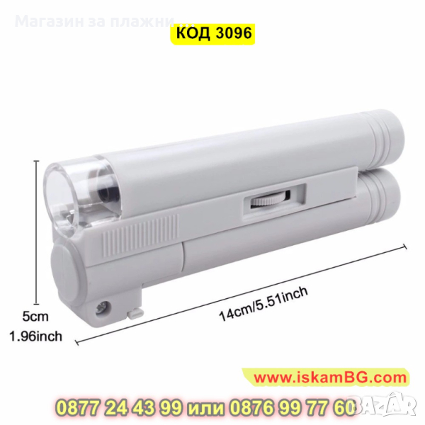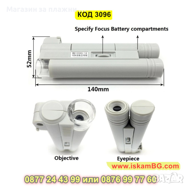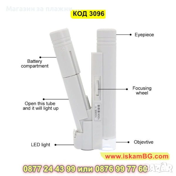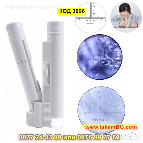 Имаме удоволствието да ви представим 100X Преносим Микроскоп - идеалният инструмент за всеки научен маняк и любител на микро-света. Този джобен микроскоп е снабден с LED подсветка и разполага с увеличение 100х, което ви позволява да разглеждате микроскопичните детайли с изключителна яснота и прецизност.
