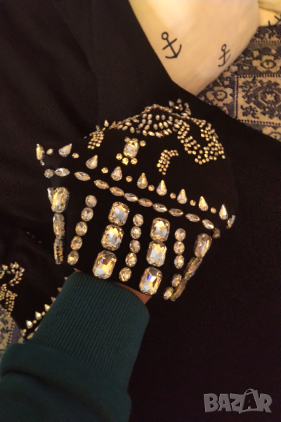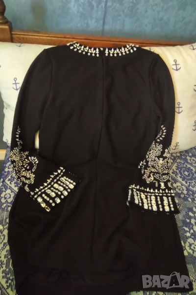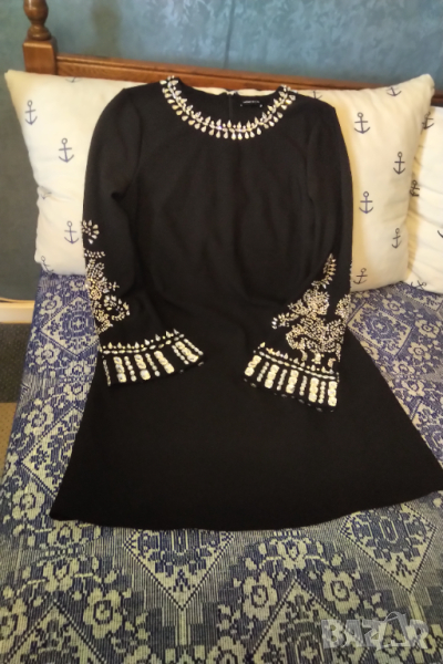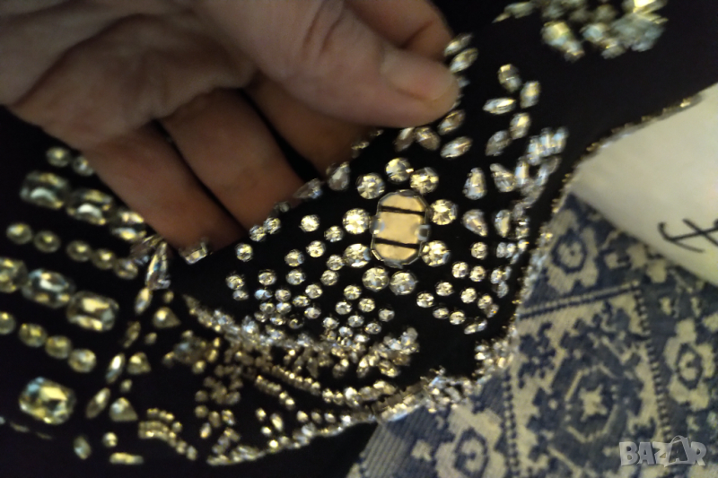 Великолепна рокля на известната марка ,черна плътна с подплата ,украса от истински камъни стъкло ( един липсва загубиха го в химическото чистене ).По етикет е 42 Л.полиестер и еластант Дължина 88 см мишници 48 см рамена 38 см .Обличала съм я 2 пъти по повод .Купувана е на двойно по висока цена .БЕЗ КОМЕНТААР И БАРТЕРИ