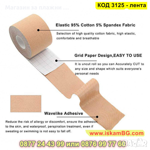 Лентата е навита на ролка и можете да изрежете с желаната ширина и да залепите върху кожата стабилно.