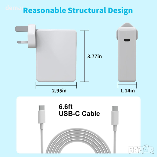Резервното зарядно за MacBook Pro е мощен, универсален аксесоар, предназначен за устройства на Apple и друга USB-C съвместима електроника. С входни спецификации от 100-240V 50-60Hz 1,8A и изходен обхват, покриващ 5V/3A до 28V/5A, той доставя до 140W мощност чрез USB C към C връзка. Това зарядно устройство е съвместимо с широк набор от продукти на Apple, включително модели на MacBook Pro от 13 до 16 инча, новия MacBook Air 13 инча през различни години, iPad Pro, iPad Air, iPad Mini 6 и модели iPhone до серия 15 , освен това може да захранва USB-C устройства като смартфони и таблети. С възможност за супер бързо зареждане благодарение на своя висококачествен eMark чип и дебели медни проводници, той може да се похвали с до 98% ефективност на зареждане, способен да презареди повечето лаптопи само за 1,5 часа и да доведе до USB-C телефони от 0% до 50% около 30 минути. Предлага се със строги сертификати за безопасност за защита срещу промени в напрежението, прегряване, презареждане и късо съединение, като гарантира както производителност, така и безопасност за вашите устройства.