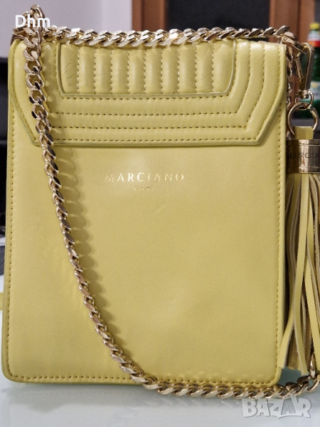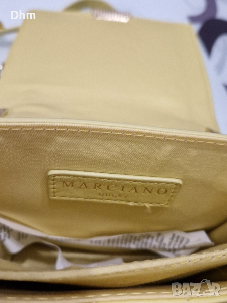 Дамска чанта - Mini Marciano Guess, в бледо жълто. Външна част от кожа, с размери 16х20х7см. Затваряне с капак, с две отделения.Регулируема презрамка, дължина прибл. 110/130см.Бледо златисти метални части. Предно метално лого. Продава се антиорахива торба за съхранение.