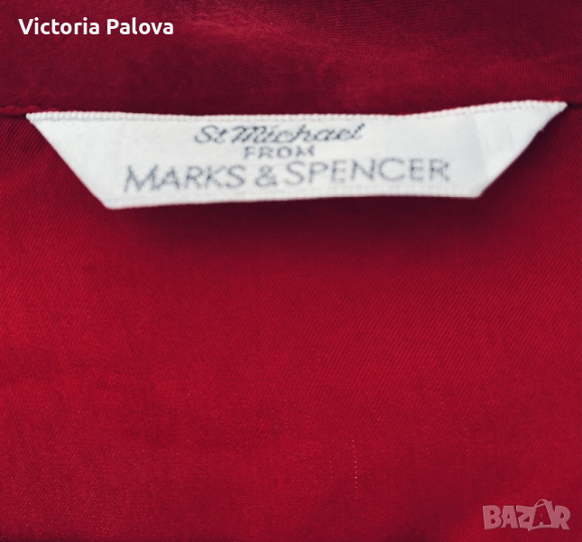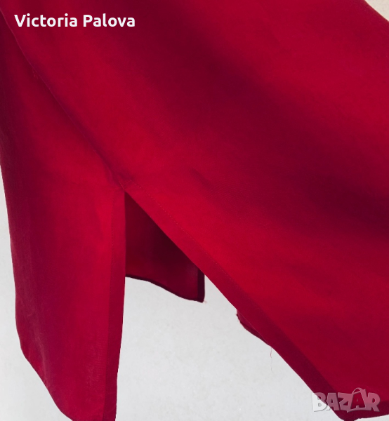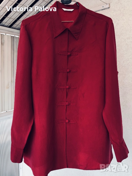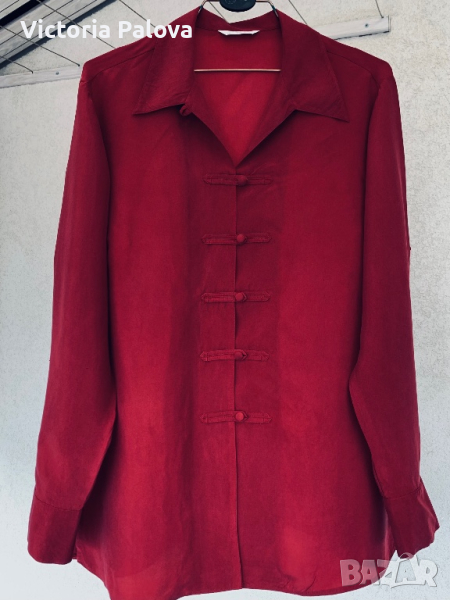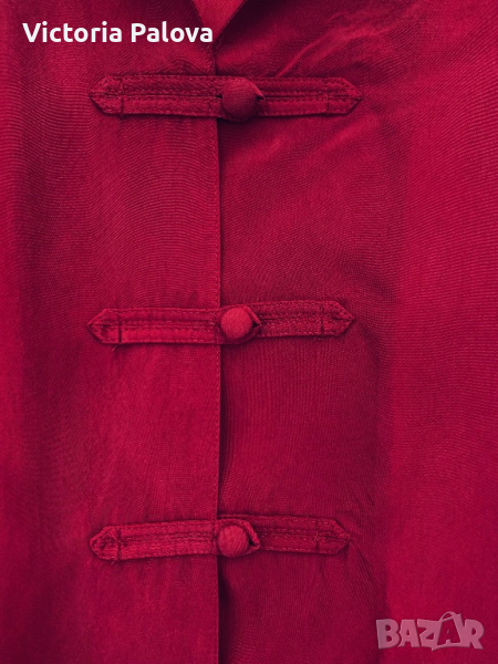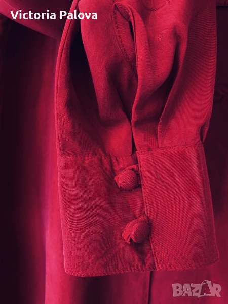 Маркова риза , тежка материя с копринен блясък, много красиви облечени копчета, високи цепки от двете страни ( 22см) , прекрасен малинов цвят. Рамо - 45см, ГО - 60, дължина - 74см, ръкав - 60см.