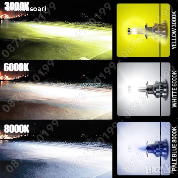ТРИ ЦВЯТА 300W 360° LED Диодни крушки H7 12-24V LED Крушки за фарове