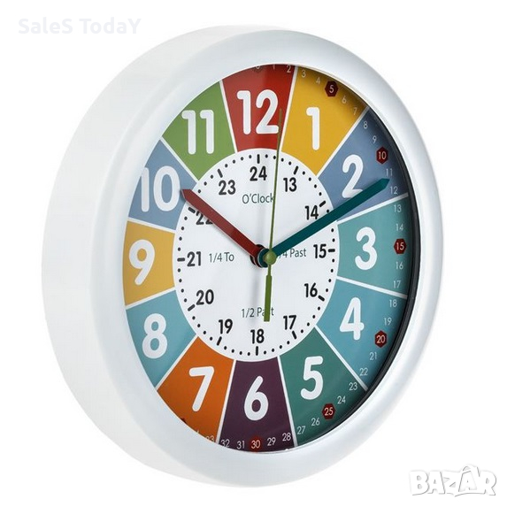 Детски образователен стенен часовник с бяла рамка и цветни маркери, в хартиена опаковка. Има индикации за детето да научи часа на английски (точно - и четвърт - и половина след - четвърт), с различни цветове на всеки пет минути и показва часа в 12-часови и 24-часови периоди. Работи с 1 AA батерия (не е включена). Включени са инструкции.